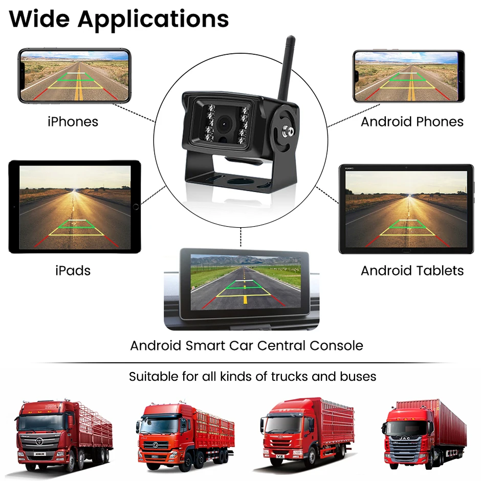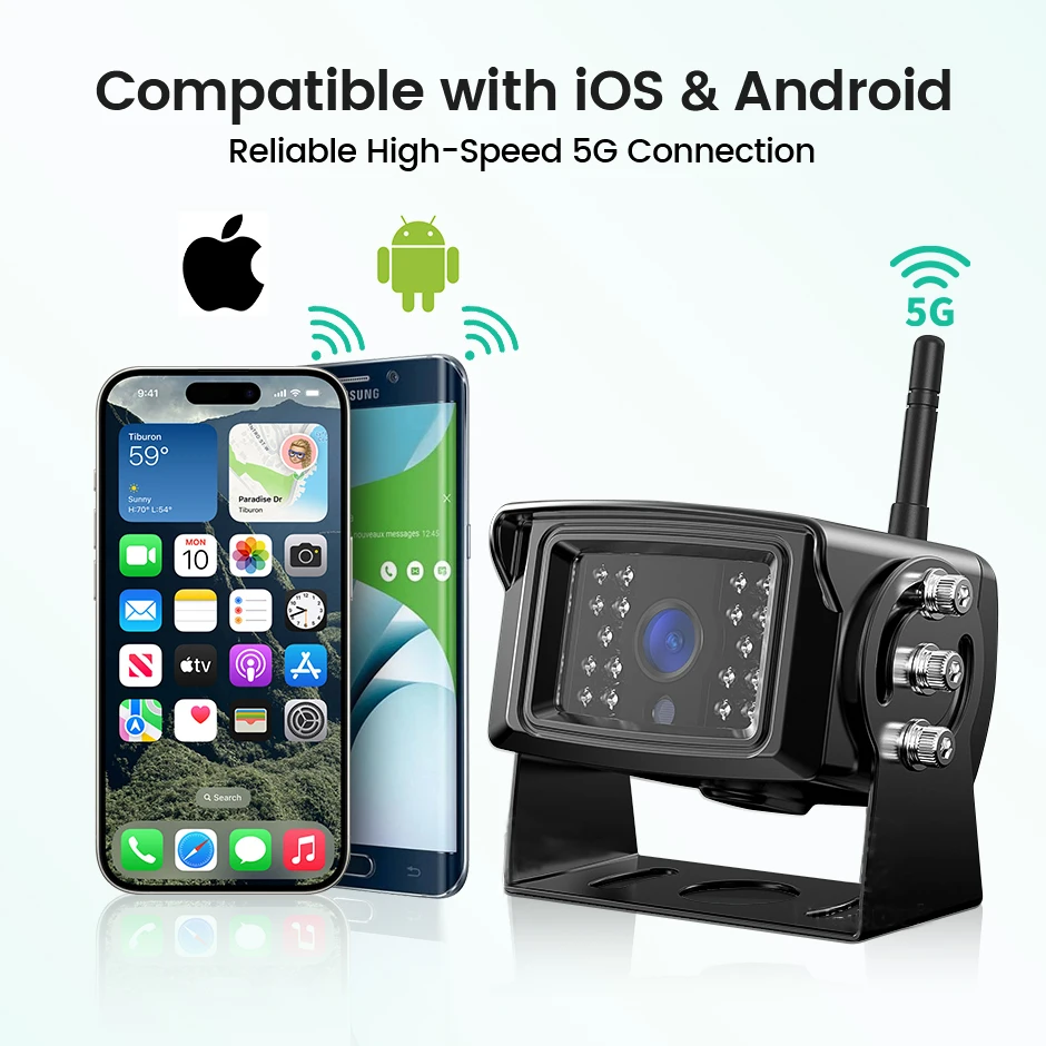 Сумісний зі смарт-пристроями – По-перше, щоб використовувати нашу бездротову камеру заднього виду 5G Wi-Fi, ваш пристрій повинен підтримувати дводіапазонний Wi-Fi (IEEE 802.11 a/b/g/n/AC 2.4 ГГц та 5 ГГц) у функціях WLAN. Ви можете перевірити це на офіційному веб-сайті вашого пристрою (сумісного з iPhone 4 або пізнішої версії). По-друге, операційна система пристрою має бути Android 5 або вище та iOS 7 або вище.